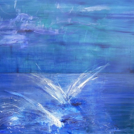Het schilderij laat het springen van vissen in een meer in Portugal zien, maar doet me ook denken aan het ijsselmeer.