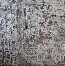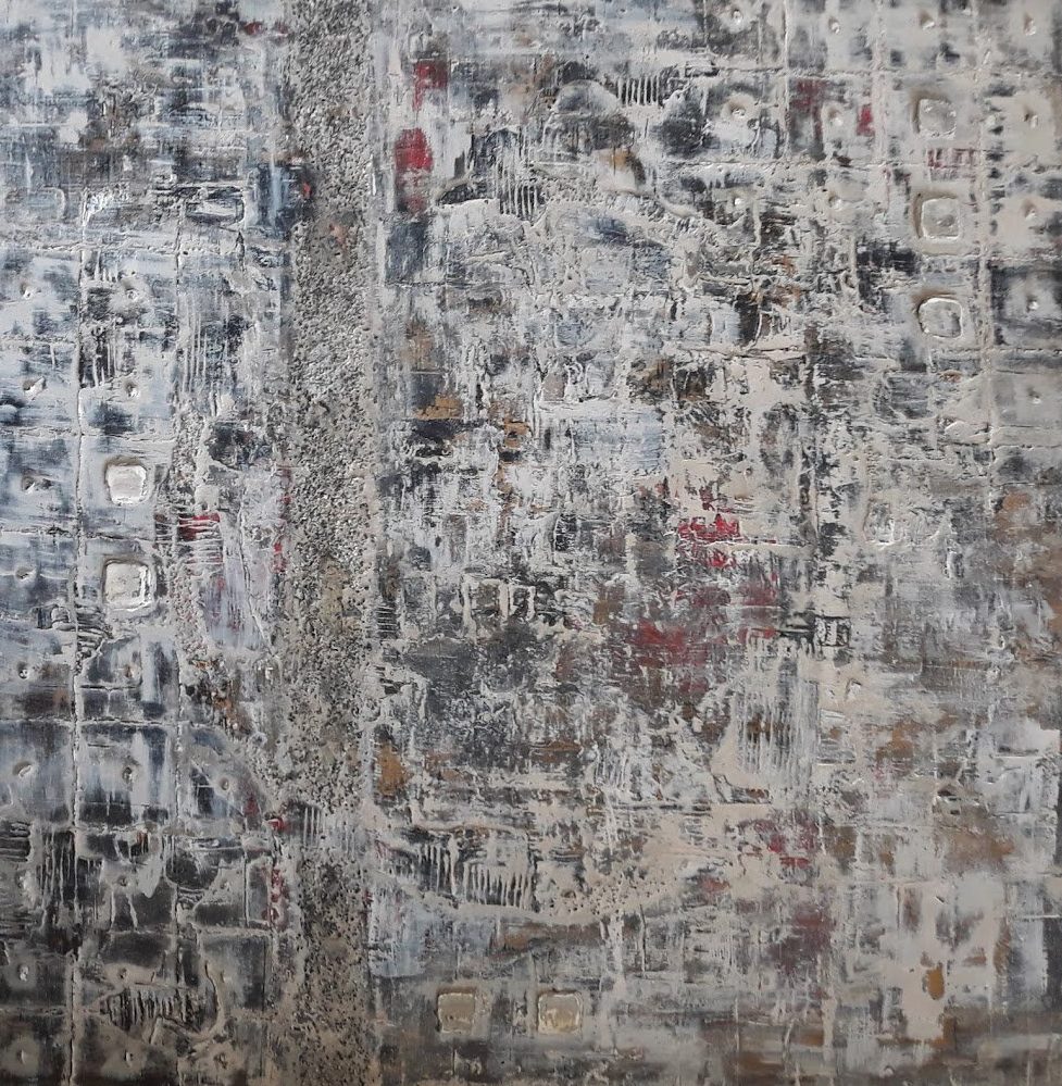 Schilderij met vele kleuren, bedekt met een afgesleten laag metselwerk, een stukje oude muur wat zijn kleurtjes weer laat zien.