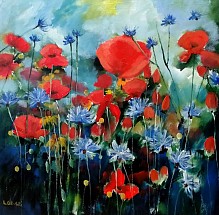 Een globale impressie van het schilderij "Klaprozen veld" 100x100cm.