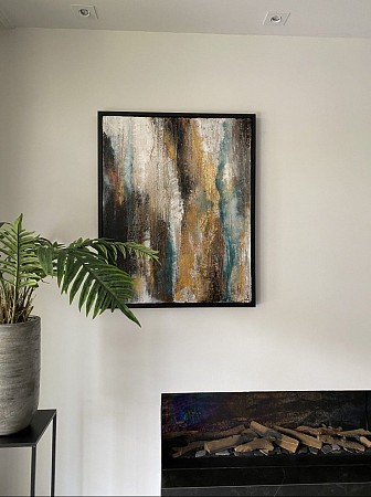 Modern Life. Mixed media schilderij met struktuur. Goud en zilver blad. Mat lak afwerking. Met zwarte bak lijst. Ophang systeem aanwezig.
