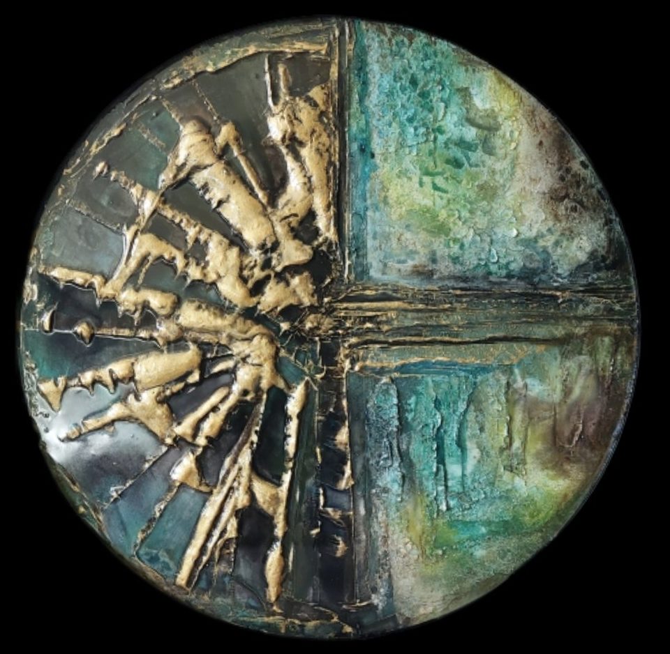 Met structuurpasta, acrylverf, crackle pasta en epoxyhars afgewerkt.