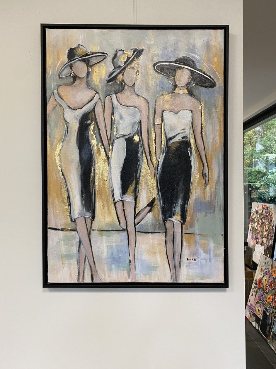 Mixed media Art. Lady,s in goud . Made to Shine . Geëxposeerd in de showroom van Totalhomeconcept in Lelystad. Hier kunt u dit kunstwerk bekijken / aankopen. Made to shine, mixed media. Acryl op doek met goudblad. Afwerking mat vernis. Ophangsysteem aanwezig .Incl. Zwarte lijst formaat 75x105
