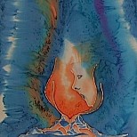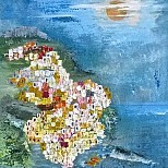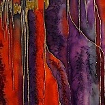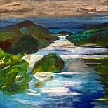 Geschilderd met acryl op linnen. Het linnen is eerst beplakt met krantenpapier en verder met schildersmes beschilderd.